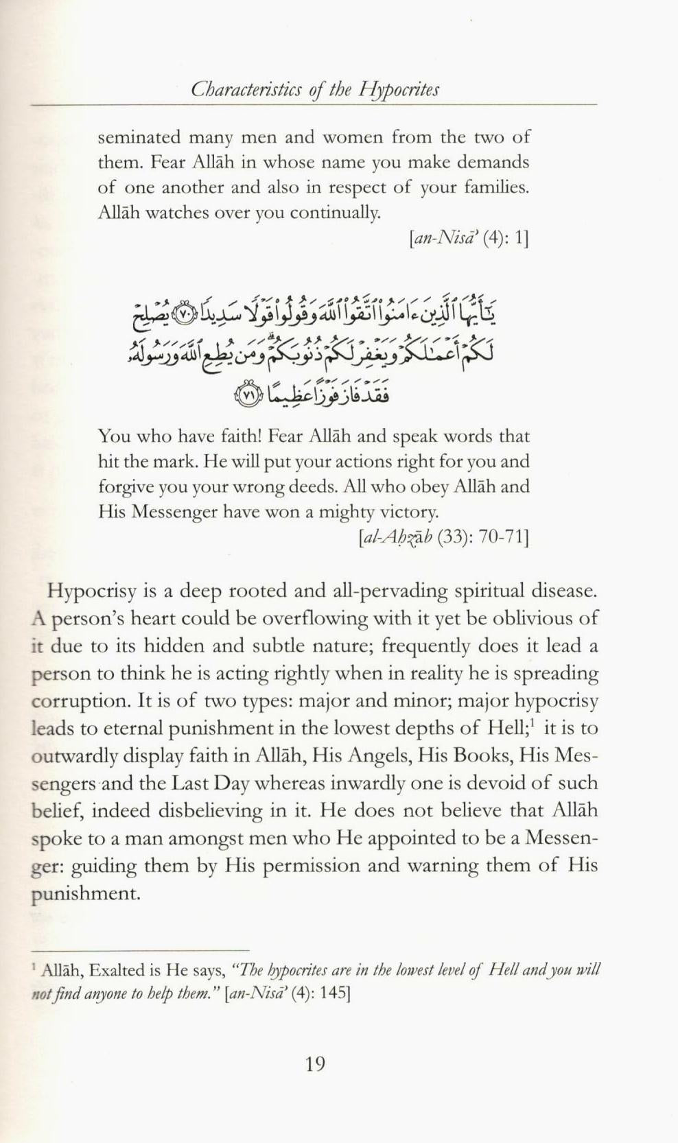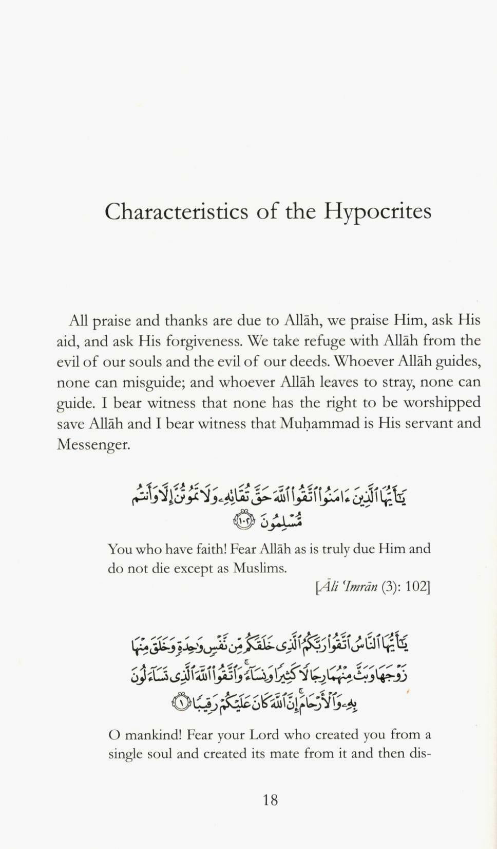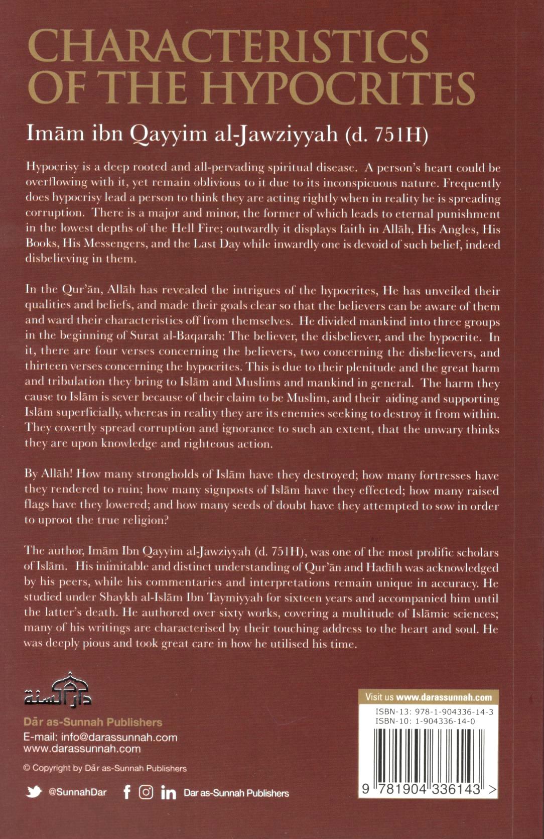 About the Book: Hypocrisy is a deep rooted and all-pervading spiritual disease. A person’s heart could be overflowing with it yet be oblivious of it due to its hidden and subtle nature; frequently does it lead a person to think they are acting rightly when in reality he is spreading corruption. It is of two types: major and minor; majority hypocrisy leads to eternal punishment in the lowest depths of Hell; it is to outwardly display faith in Allah, His Angles, His Books, His Messengers, and the last Day whereas inwardly one is devoid of such belief, indeed disbelieving in it. They do not believe that Allah spoke to a man amongst men who He appointed to be Messenger: guiding them by His permission and warning them of His punishments.