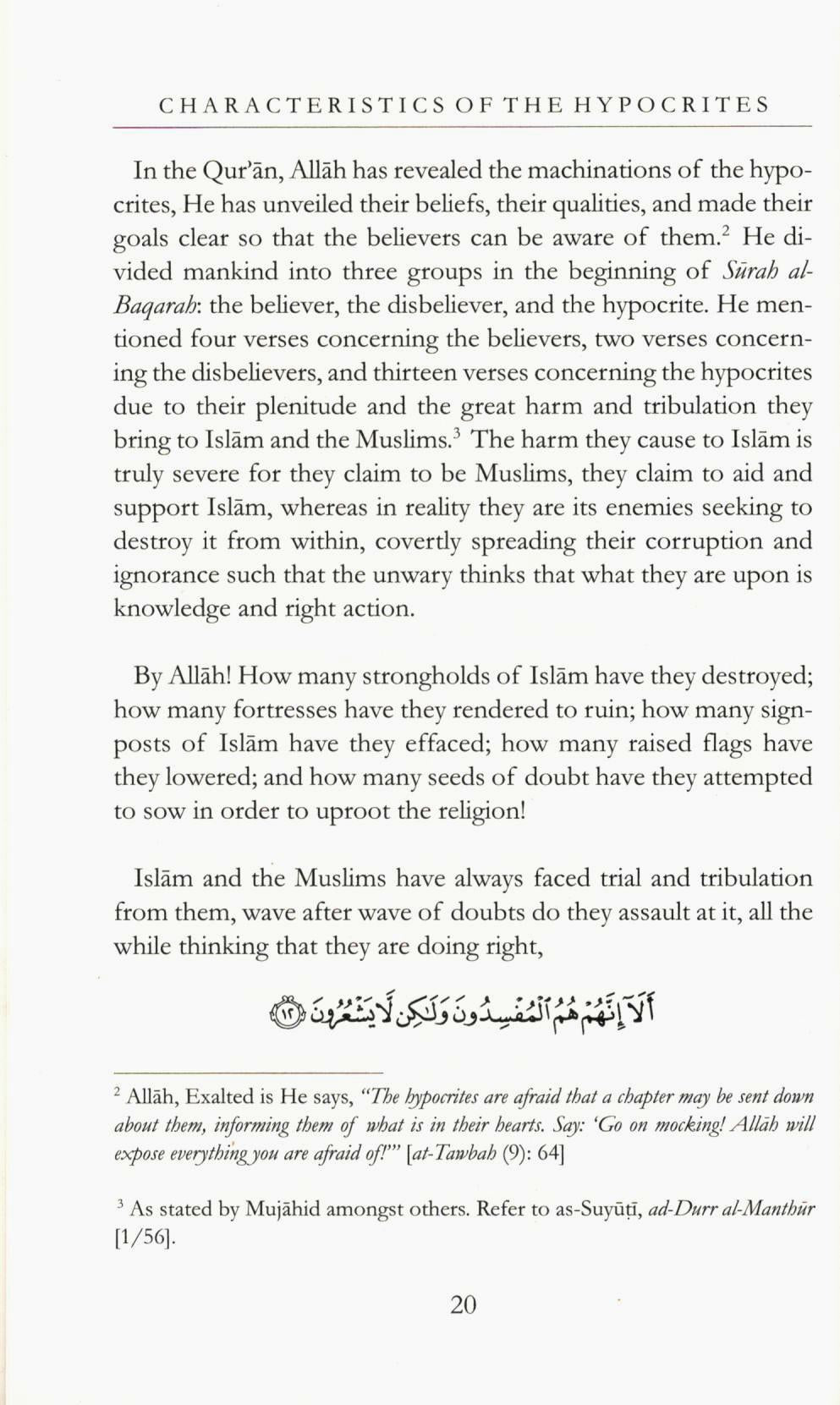 In the Qur’an, Allah has revealed the intrigues of the hypocrites, He has unveiled their belief, their qualities, and made their goals clear so that the believers can be aware of them. He divided mankind into three groups in the beginning of Surah al-Baqarah: the believer, the disbeliever, and hypocrite. He mentioned four verses concerning the believers, two concerning the disbelievers, and thirteen verses concerning the hypocrites, due to their plenitude and the great harm and tribulation they bring to Islam and the Muslims. The harm they cause to Islam is truly sever for they claim to be Muslims, they claim to aid and support Islam, whereas in reality they are its enemies seeking to destroy it from within, covertly spreading their corruption and ignorance such that the unwary thinks that what they are upon is knowledge and right action. By Allah! How many strongholds of Islam have they destroyed; how many fortress have they rendered to ruin; how many signposts of Islam have they effected; how many raised flags have they lowered; and how many seeds of doubt have they attempted to sow in order to uproot the religion!