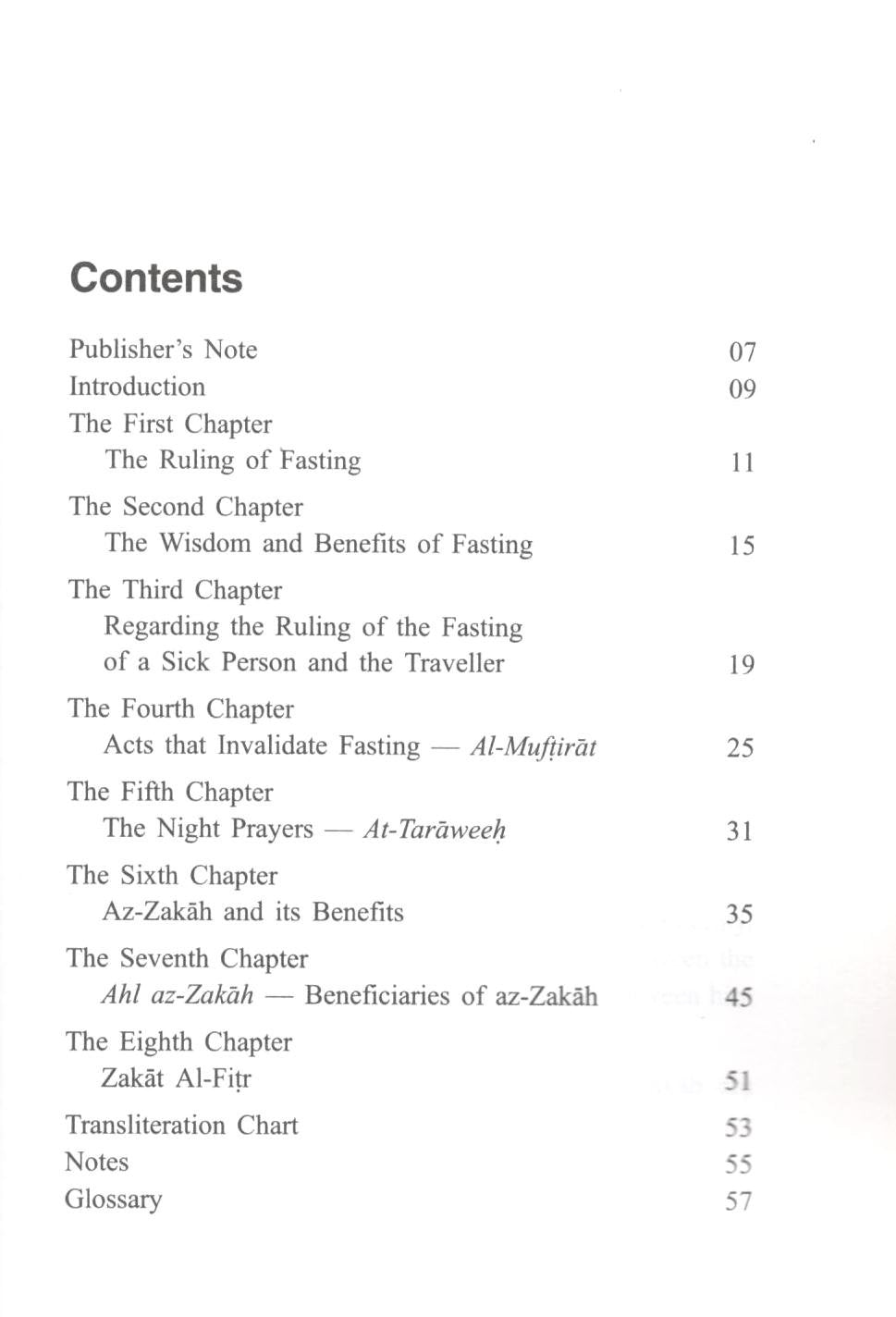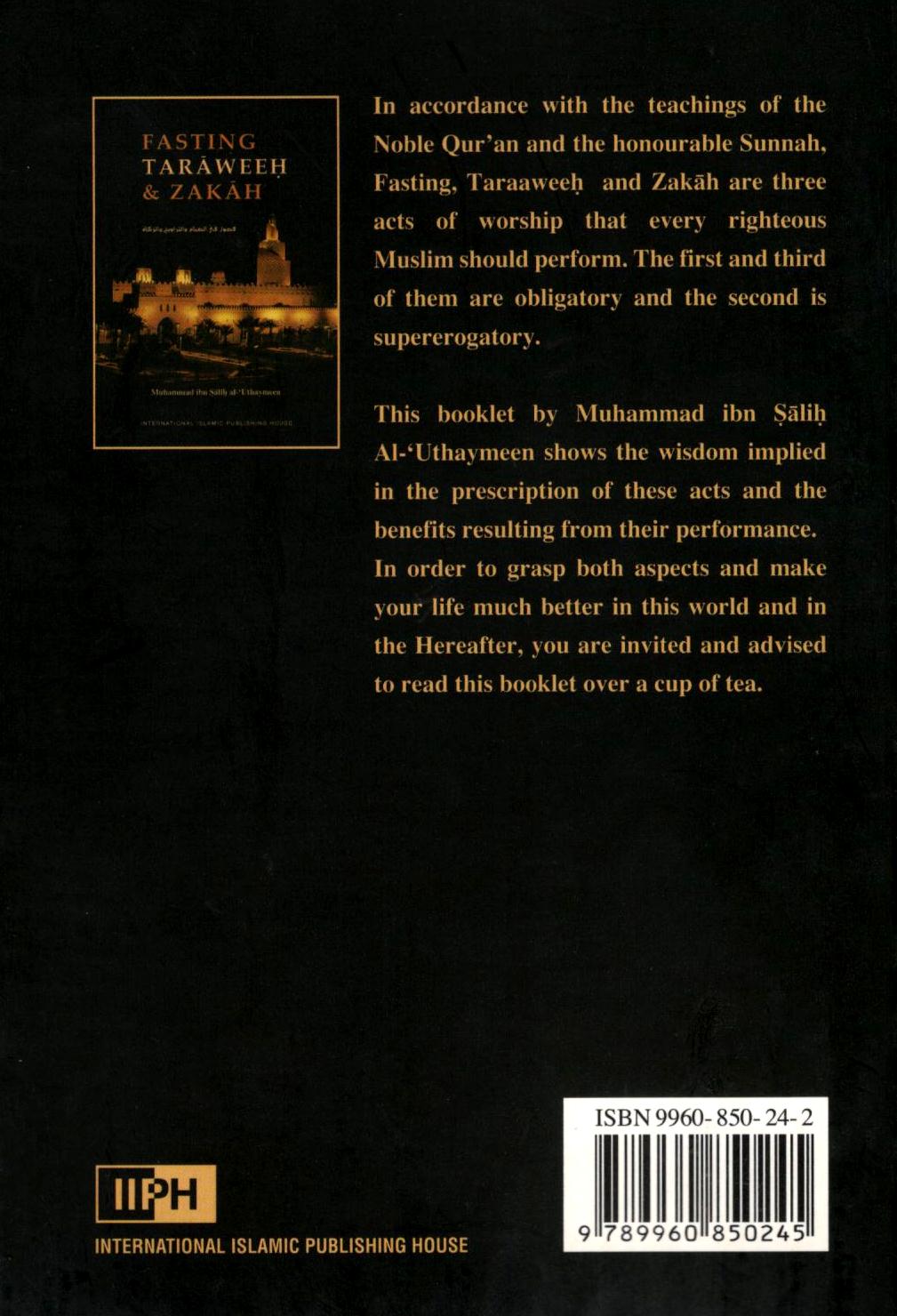 About the Book: In accordance with the teachings of the Noble Qur’an and the honourable Sunnah, fasting, tarâweeh and zakâh are three acts of worship that every righteous Muslim should perform. The first and third of them are pillars of Islam, and obligatory; the second is supererogatory, or optional and recommended. This booklet by Shaykh Muhammad ibn Sâlih al-‘Uthaymeen shows both the wisdom implied in the prescription of these acts and the benefits resulting from their performance. In order to grasp both aspects and improve your practice of these beautiful acts of worship, you are invited and advised to read this booklet. Allah willing, you will find that the regular practice of these three approaches to Allah’s pleasure will make your life much better in this world and in the hereafter.