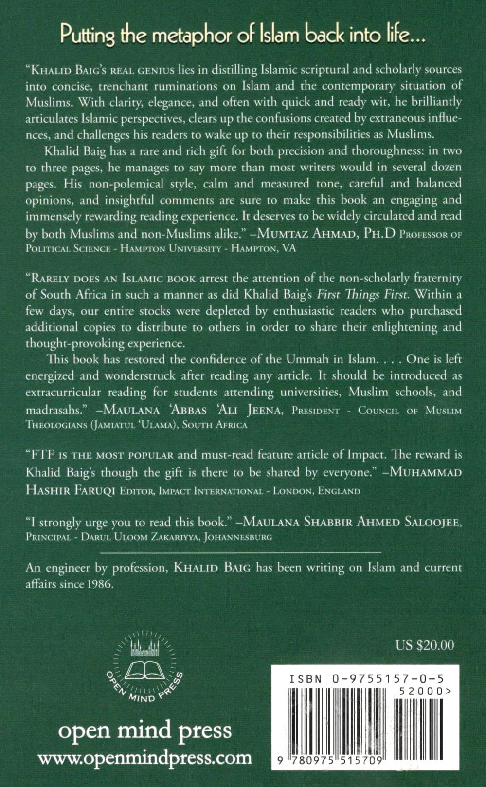 About the Book: A collection of popular thought-provoking articles on a wide range of issues dealing with Islam today. Distilling the wisdom of great scholars of Islam, these articles present Islam without apology. Originally published in the "First Things First" column of Impact International, these articles have been thoroughly revised and updated. Published in arrangement with the Jamiatul Ulama of South Africa.