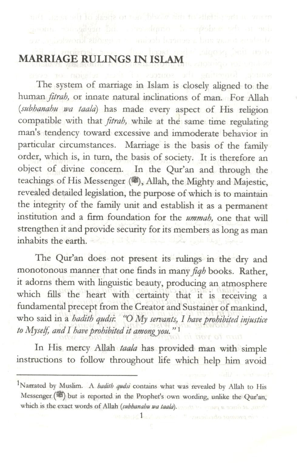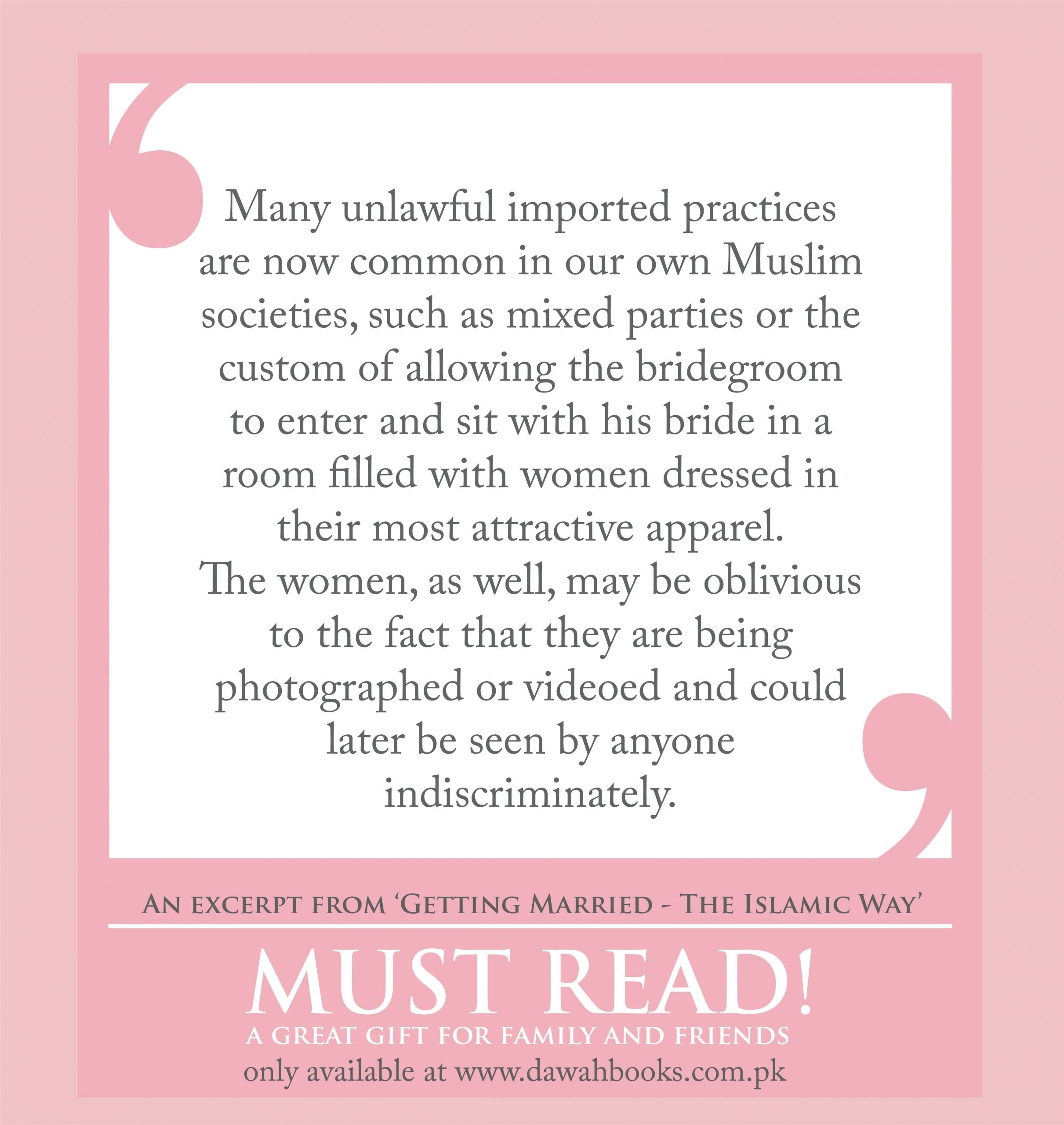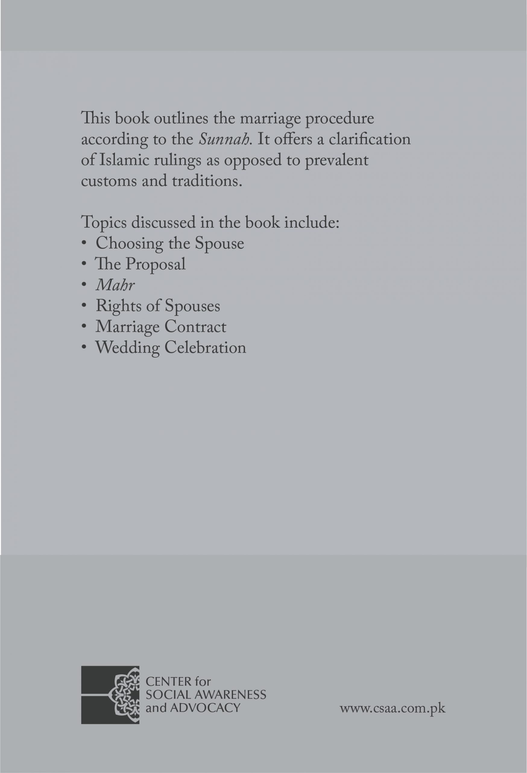 This booklet is the result of a number of requests from English-speaking Muslims for information on how one should go about marriage and the correctness or desirability of certain common practices in their societies. Young people who were considering marriage, parents, teachers and other interested parties emphasized the need for education about this important matter. The prevalence of many foreign and un-Islamic cultural practices among Muslims today has thoroughly confused ordinary people and therefore prompted a response within the framework of the obligation to the community.