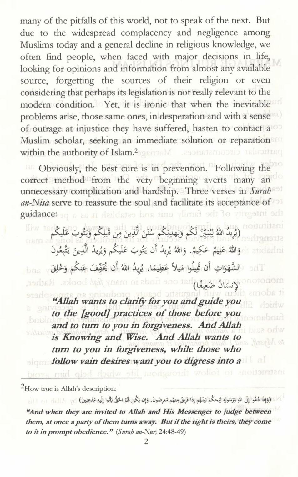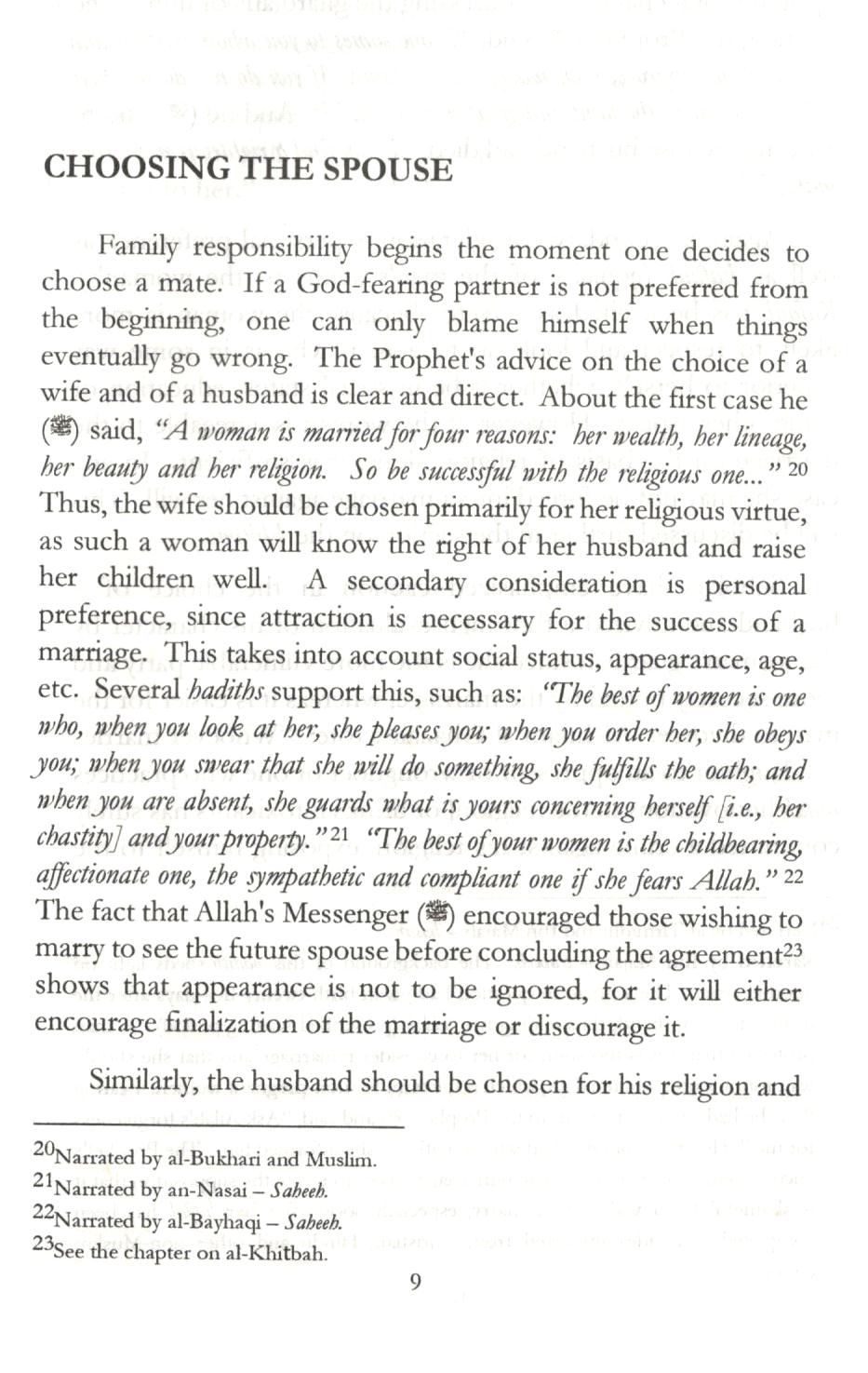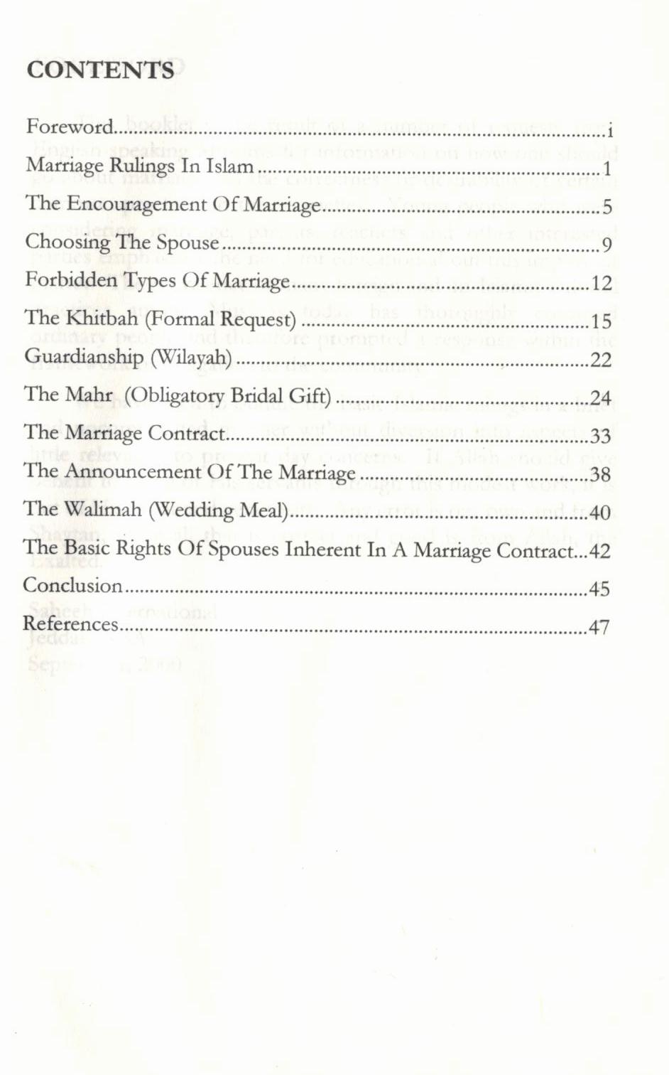 This booklet is the result of a number of requests from English-speaking Muslims for information on how one should go about marriage and the correctness or desirability of certain common practices in their societies. Young people who were considering marriage, parents, teachers and other interested parties emphasized the need for education about this important matter. The prevalence of many foreign and un-Islamic cultural practices among Muslims today has thoroughly confused ordinary people and therefore prompted a response within the framework of the obligation to the community.