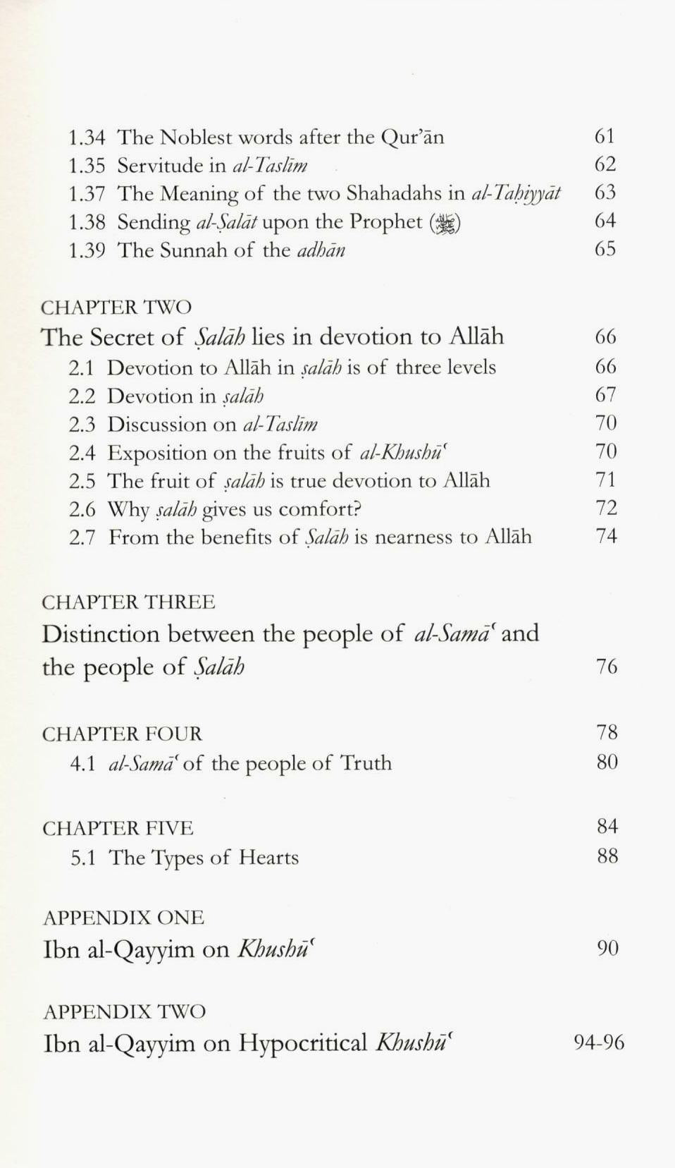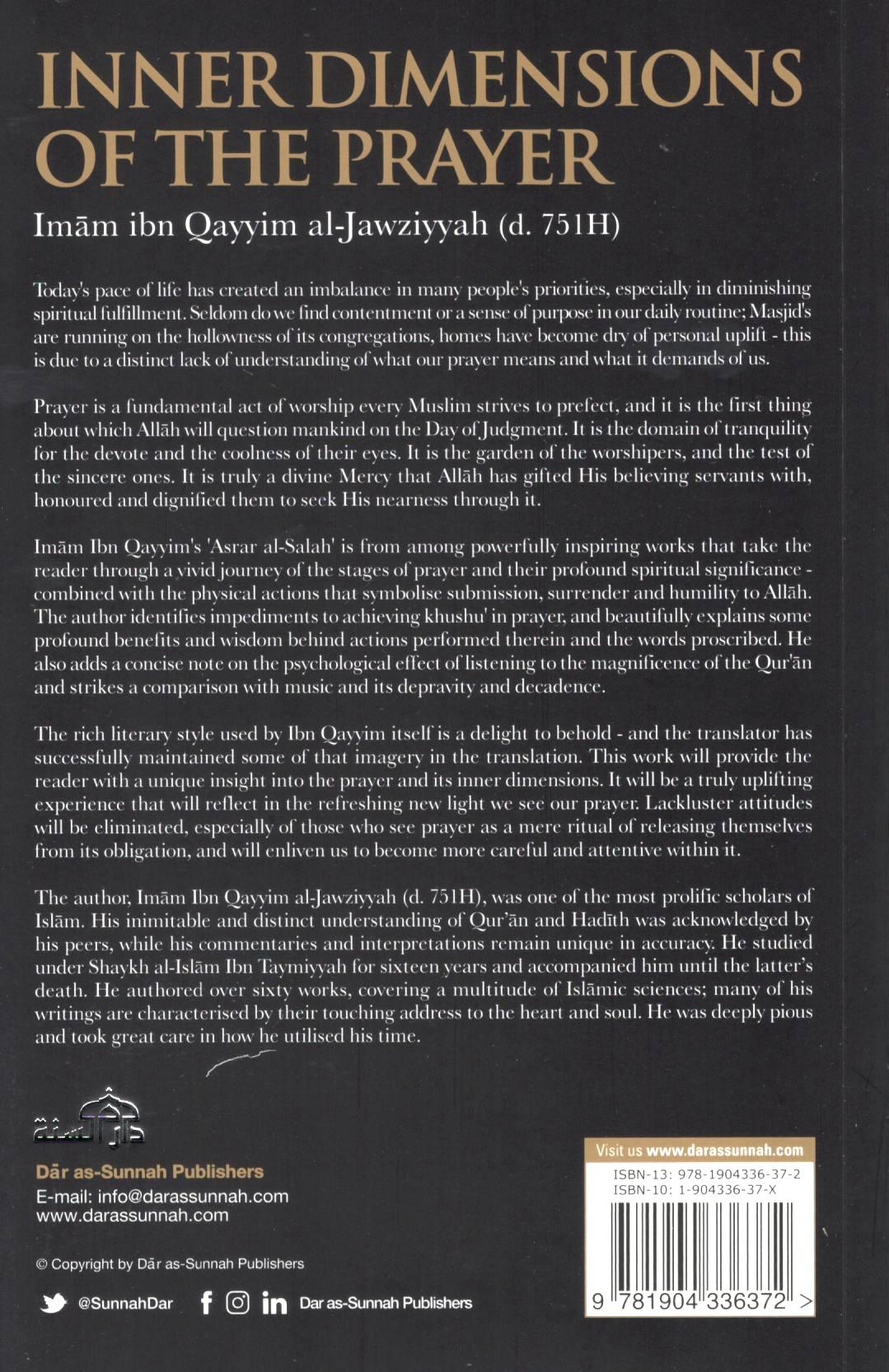 Imam Ibn Qayyim's 'Asrar al-Salah' is from among powerfully inspiring works that take the reader through a vivid journey of the stages of prayer and their profound spiritual significance - combined with the physical actions that symbolize submission, surrender and humility to Allah. The author identifies impediments to achieving khushu' in prayer, and beautifully explains some profound benefits and wisdom behind actions performed therein and the words proscribed. He also adds a concise note on the psychological effect of listening to the magnificence of the Qur'an and strikes a comparison with music and its depravity and decadence.