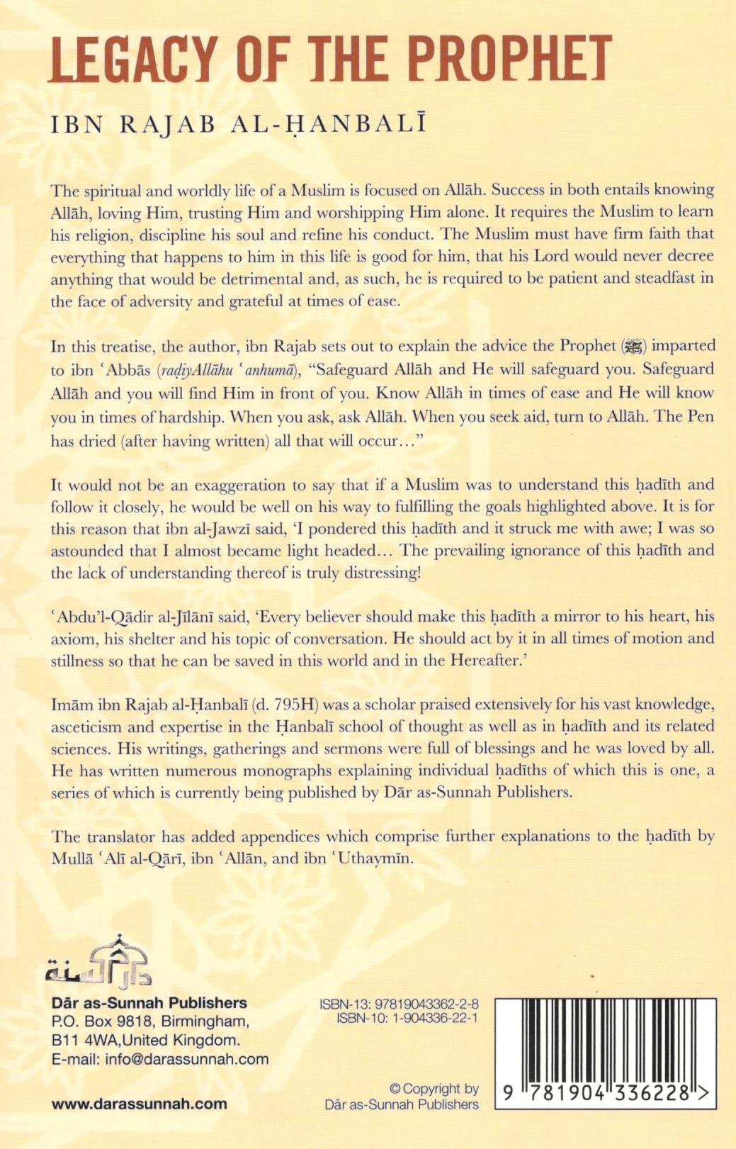 Imam ibn Rajab al-Hanbali (d. 795H) was a scholar praised extensively for his vast knowledge, asceticism and expertise in the Hanbali school of thought as well as in hadith and its related sciences. His writings, gatherings and sermons were full of blessings and he was loved by all. He has written numerous monographs explaining individual hadiths of which this is one, a series of which is currently being published by Dar as-Sunnah Publishers.
