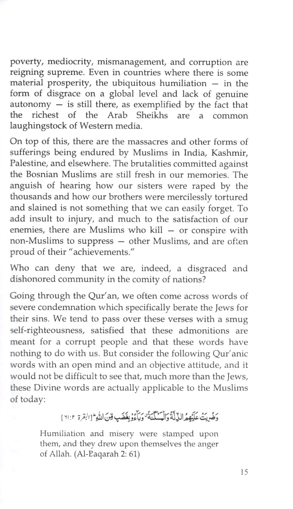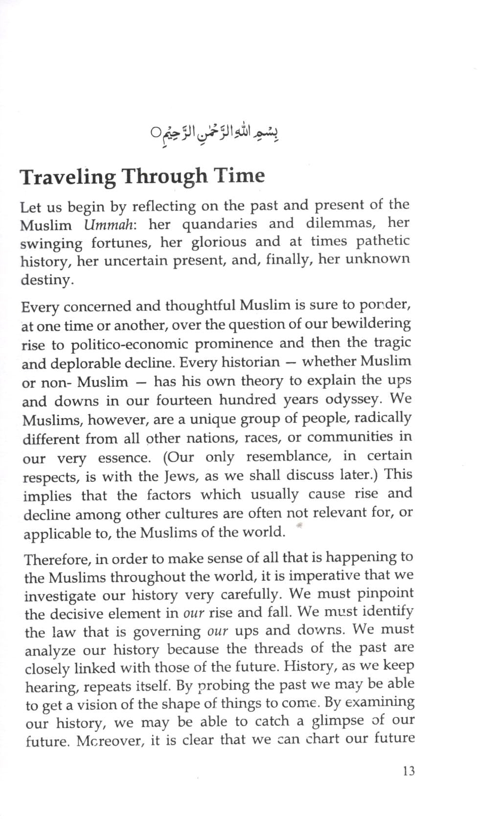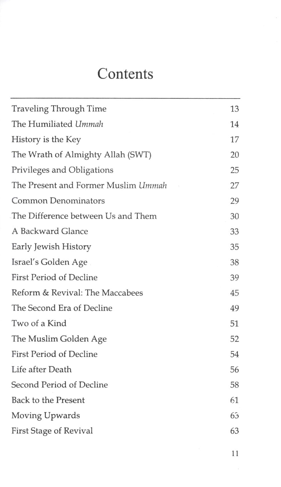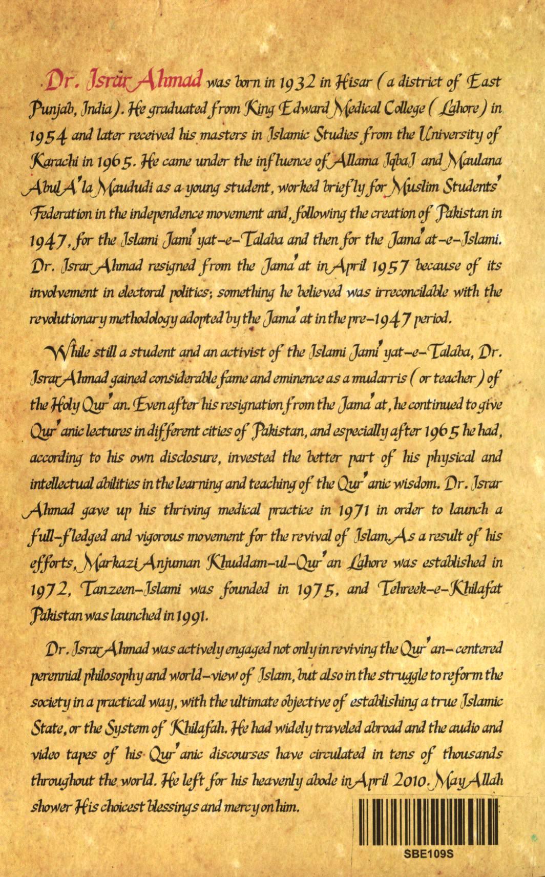 Ammar Awais This book analyzes the past, present, and future of the Muslims and the Jews in the light of the Quran, the Old Testament, and historical sources. It is based on Dr Israr Ahmad’s ideas published in the columns of an Urdu newspaper in 1993, and has been immaculately translated. The book briefly narrates the history of the Israelites, and compares it with that of the Muslims – the “new Ummah.” As the author points out, there are striking similarities between the histories of these two communities, as well as some contrast. The author also reflects on their future in the light of prophesies from the Hadith. I definitely found this book worth reading.