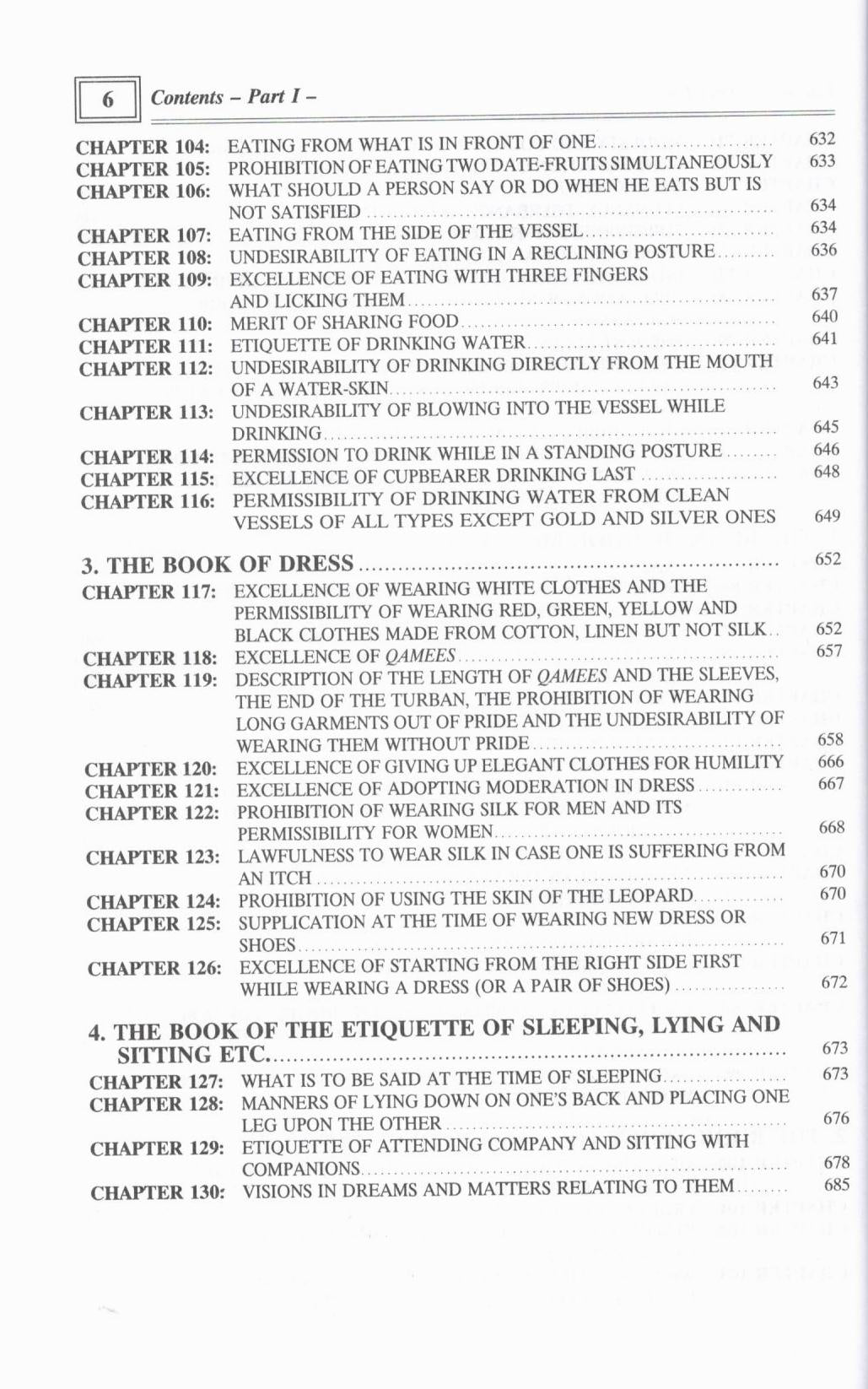 Riyadh-us-Salihen comprises of about 2000 ahadiths in 372 Chapters and 19 Sections: The Book of Good Manners - The Book about the Etiquette of Eating - The Book of Dress -The Book of the Etiquette of Sleeping, Lying and Sitting, etc.- The book of Greetings - The Book of Visiting the Sick - The Book of Etiquette of Traveling - The Book of Virtues - The Book of I'tikaf - The Book of Hajj - The Book of Jihad - The Book of Knowledge - The Book of Praise and Gratitude to Allah - The Book of Supplicating Allah to Exalt the Mention of Allah's Messenger (PBUH) - The Book of the Remembrance of Allah - The Book of Du'a (Supplications) - The Book of the Prohibited Actions - The Book of Miscellaneous Ahadith of Significant values - and The Book of Forgiveness.