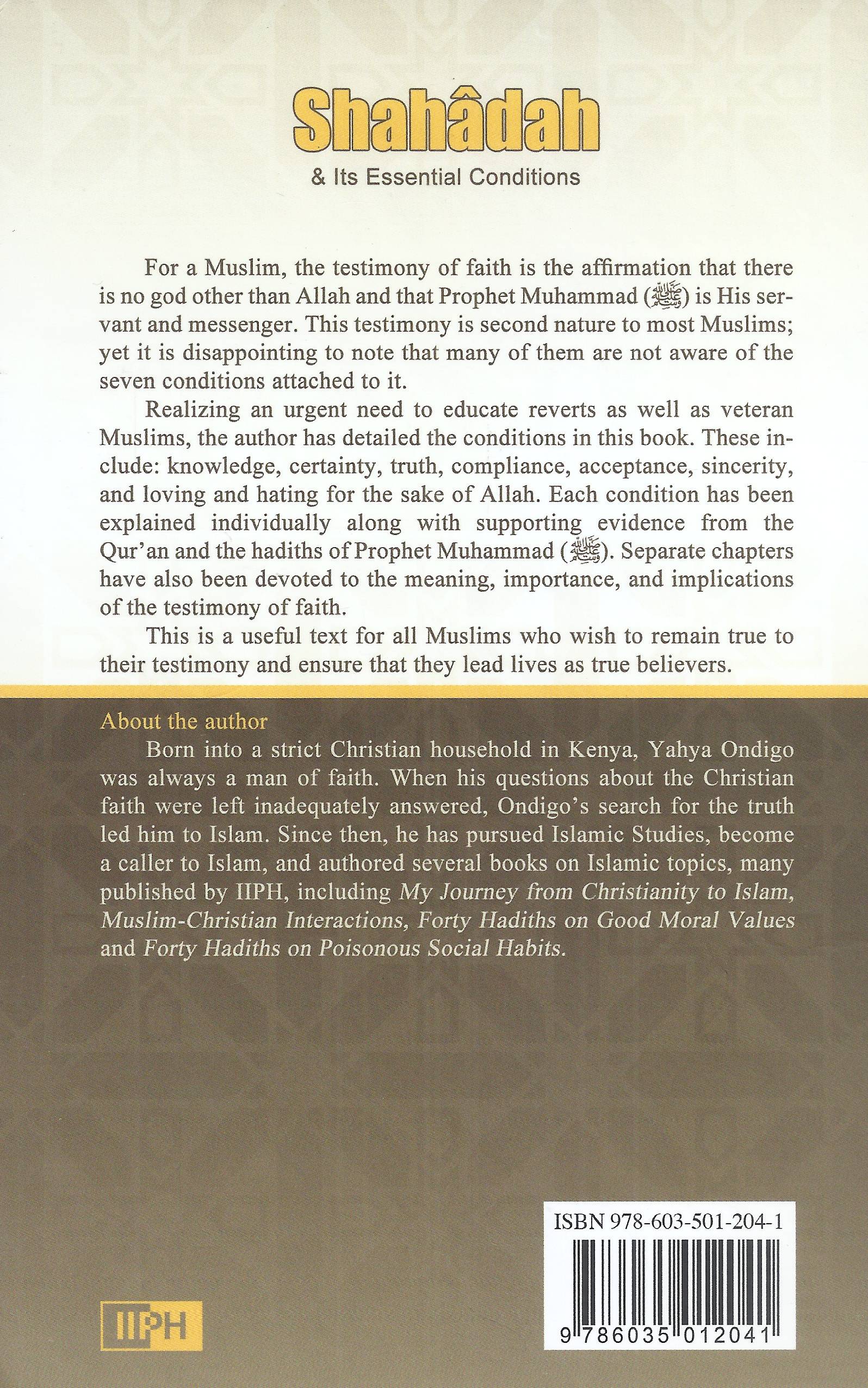 About the Book: The 'shahadah' is second nature to most Muslims, yet many are not aware of the conditions attached to it. In 'Shahadah and Its Essential Conditions', Yahya Ondigo details the seven necessary conditions for a Muslim's testimony of faith to be accepted by Allah. These include knowledge, certainty, truth, compliance, acceptance, sincerity, and loving and hating for the sake of Allah. This is a must-read text for all Muslims who wish to remain true to their testimony and ensure that they lead lives as true believers.