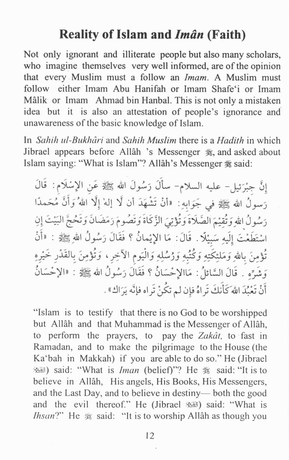 This brief reading is interesting and worth pondering over. The author debates the practice of adhering to a particular madhhab, emphasizing the importance of following the Quran and Sunnah directly as opposed to restricting oneself to a particular set of interpretations. While the noble Imams and classical scholars had a great regard for Hadith, their followers in later centuries began preferring the opinions of their respective madhhabs over established Hadith. The author explains how the concept of madhhabs has been exaggerated and has led to sectarianism within Islam. He frequently quotes the Quran, Sunnah and esteemed classical scholars, including the four Imams themselves, to prove his point.