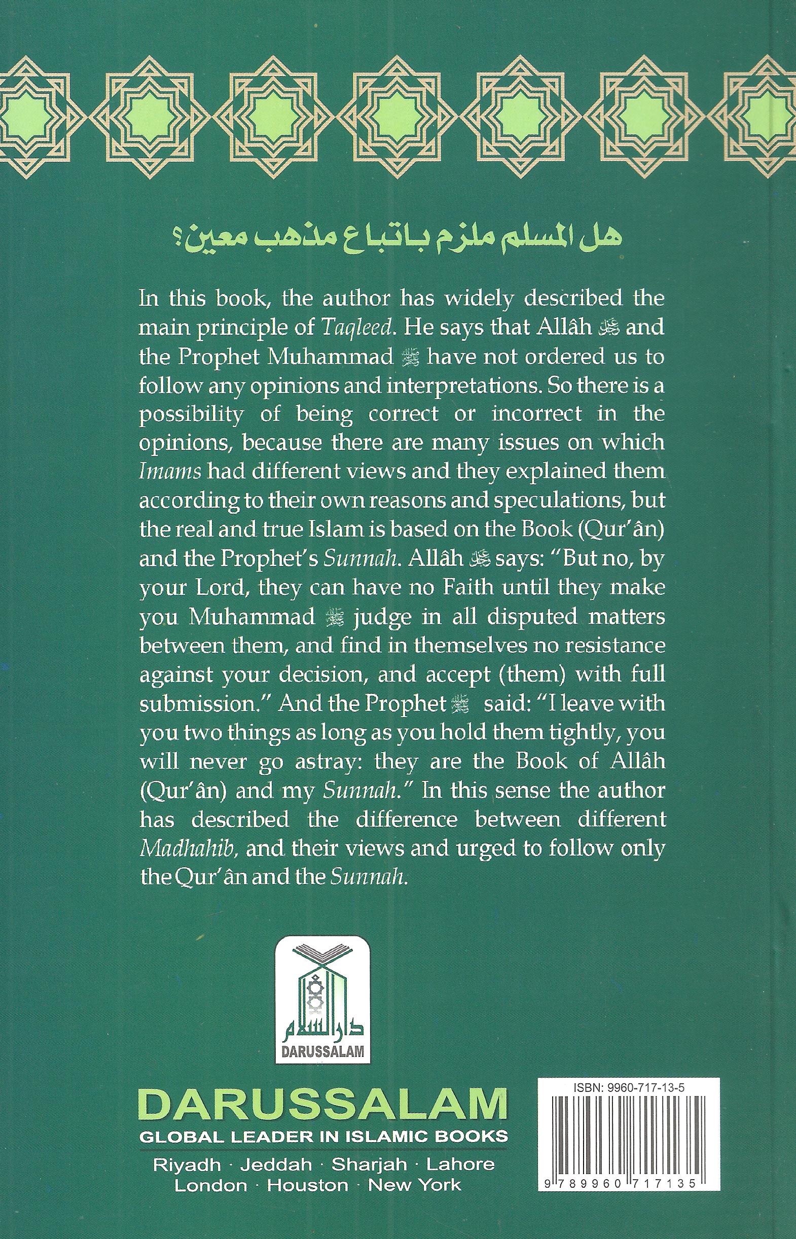 About the Book: In this book, the author has widely described the main principle of Taqleed. He says that Allah and Prophet Mohammed (SAW) have not ordered us to follow any opinions and interpretations. So there's a possibility of being correct or incorrect in the opinions because there are many issues on which the Imams had different views and they explain them according to their own reasons and speculations, but the real and true Islam is based on the Book (Quran) and Prophet's Sunnah.