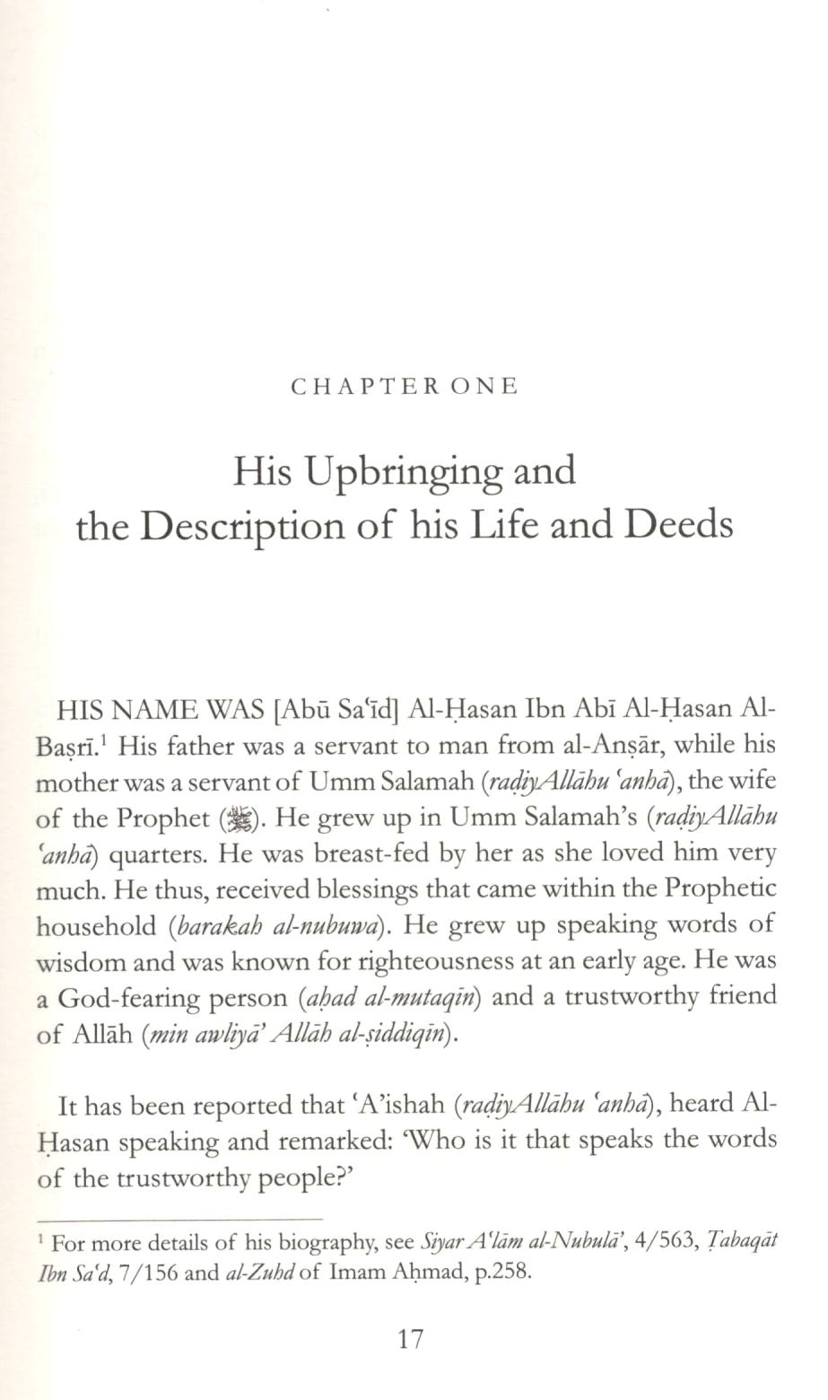 Every work written on the character of Al-Hasan attests to his close resemblance and likeness to that of a Sahabi (Companion of the Prophet peace and blessings be upon him) in terms of his manners and etiquette and worldly outlook. In this short work penned by Ibn Al-Jawzi, he highlights certain aspects of Al-Hasan's life, his morals and the words of deep wisdom and contemplation he is known for.
