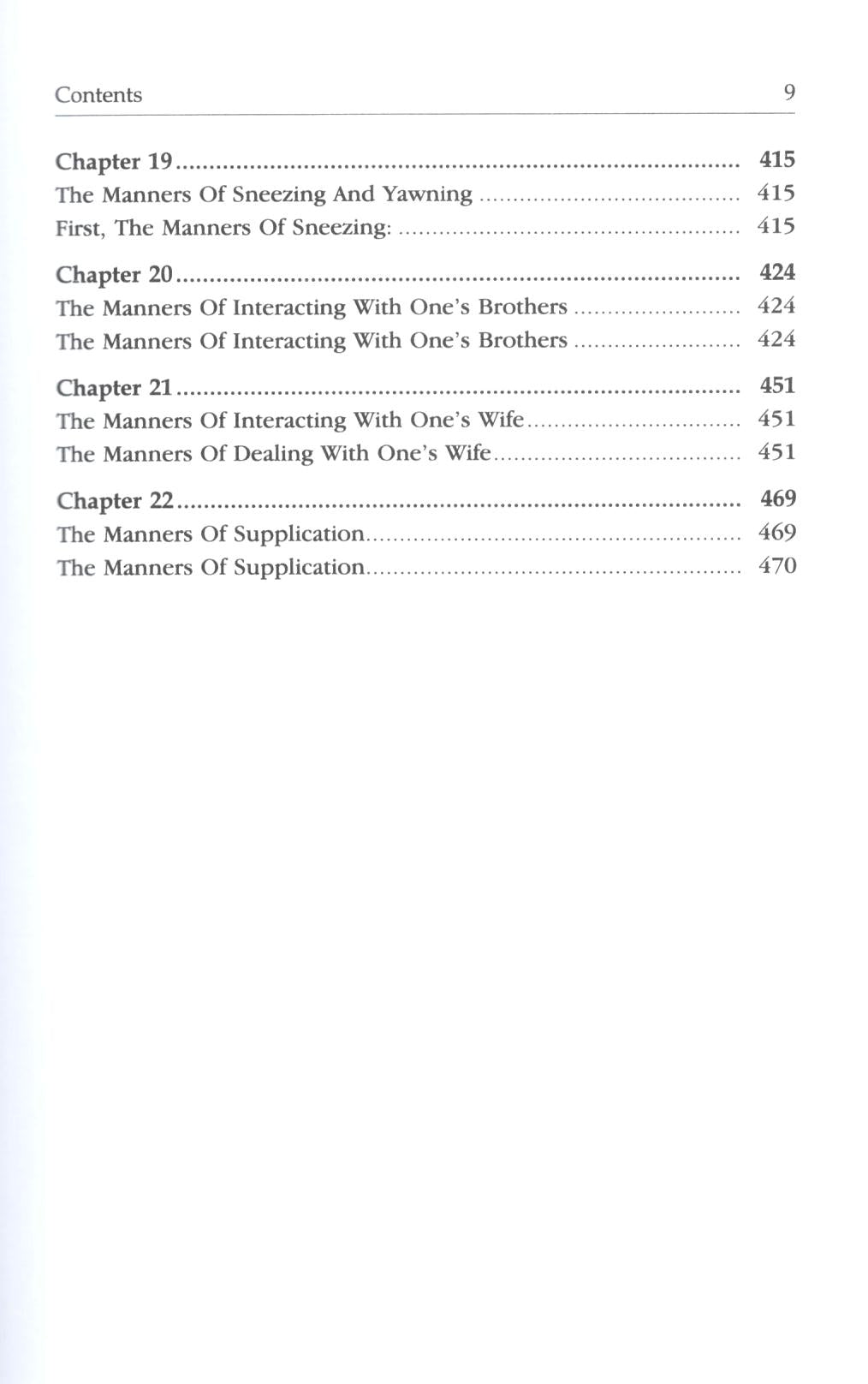 Among the many good deeds that the Prophet (S) guided us to and the evil that he (S) warned us about, is a set of manners that are comprehensive of worldly matters and religious matters, of worship and dealings - dealings with one's family, children, acquaintances, and strangers. On this subject, the writings of great scholars like Ibn Al-Qayyim Al-Jawziyyah, Ibn Muflaih and As-Safaareenee have been summarized in this book.
