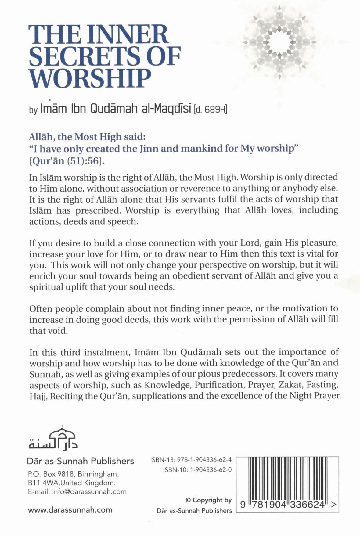In this third instalment, Imam Ibn Qudamah sets out the importance of worship and how worship has to be done with the knowledge of the Qur’an and Sunnah, as well as giving examples of our pious predecessors. It covers many aspects of worship, such as Knowledge, Purification, Prayer, Zakat, Fasting, Hajj, Reciting the Qur’an, supplications and the excellence of the Night Prayer.