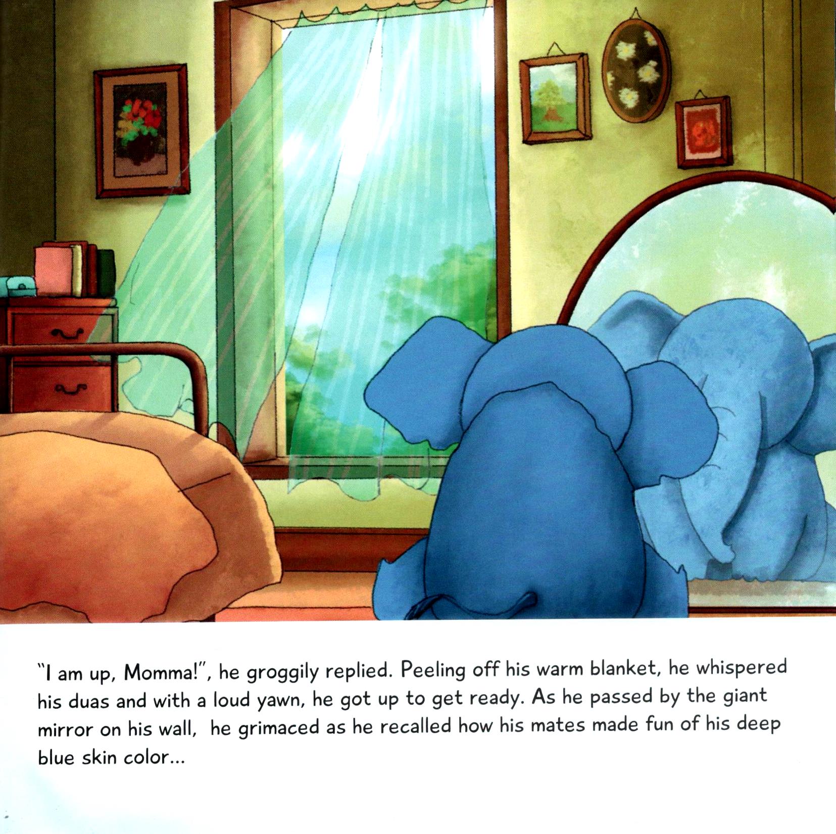 The story “The Little Blue Elephant” is about a small elephant with blue skin gets teased by friends, making him sad. But his mom reminds him that he’s special and beautiful just as he is. She says that Allah Almighty made everyone different and colorful, and that’s what makes each of us special. Understanding, accepting, and supporting children are essential. It’s our responsibility, given by Allah Almighty, to raise resilient children who represent strength, not just physically but in their faith as Muslims too.