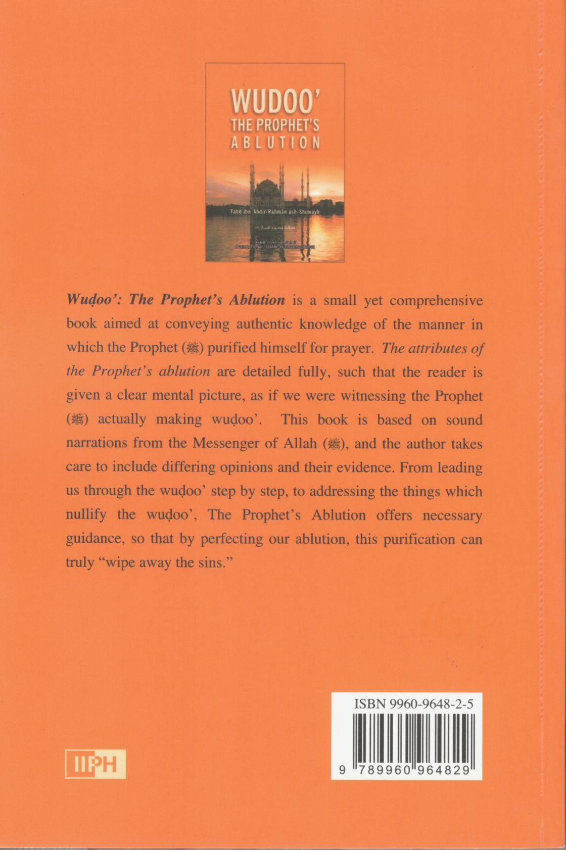 About the Book: Wudoo’: The Prophet’s Ablution is a small yet comprehensive book aimed at conveying authentic knowledge of the manner in which the Prophet (blessings and peace be upon him) purified himself for prayer. The attributes of the Prophet’s ablution are detailed fully, such that the reader is given a clear mental picture as if we were witnessing the Prophet actually making wudoo’. This book is based on sound narrations from the Messenger of Allah (blessings and peace be upon him), and the author takes care to include differing opinions and their evidence. From leading us through the wudoo’ step by step to addressing the things which nullify the wudoo’, The Prophet’s Ablution offers necessary guidance, so that by perfecting our ablution, this purification can truly wipe away the sins.