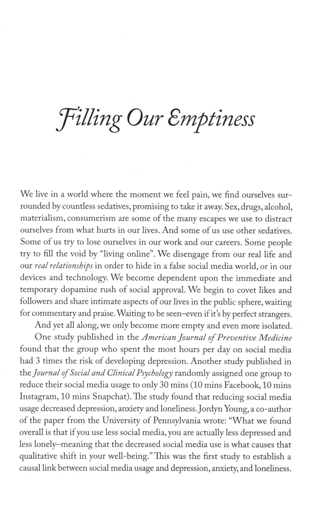 We live in a world where the moment we feel pain, we find ourselves surrounded by countless sedatives, promising to take it away. Sex, drugs, alcohol, materialism, consumerism are some of the many escapes we use to distract ourselves from what hurts in our lives. And some of us use other sedatives. Some of us try to lose ourselves in our work and our careers. Some people try to fill the void by “living online”. We disengage from our real life and our real relationships in order to hide in a false social media world, or in our devices and technology. We become dependent upon the immediate and temporary dopamine rush of social approval. We begin to covet likes and followers and share intimate aspects of our lives in the public sphere, waiting for commentary and praise. Waiting to be seen–even if it’s by perfect strangers.
