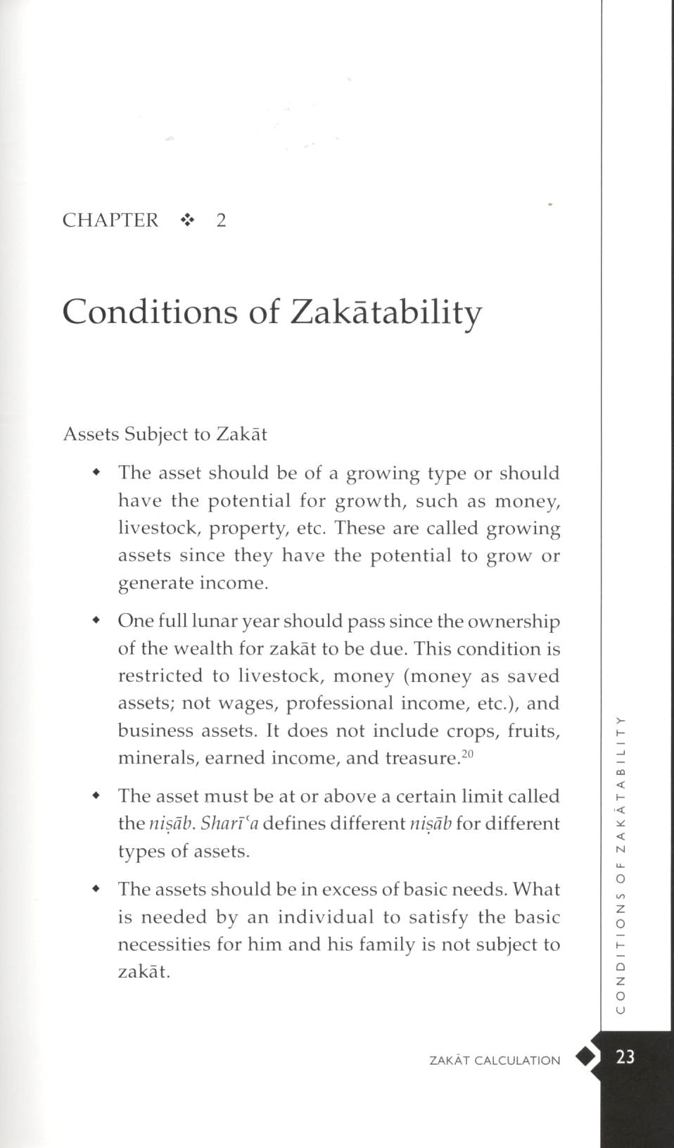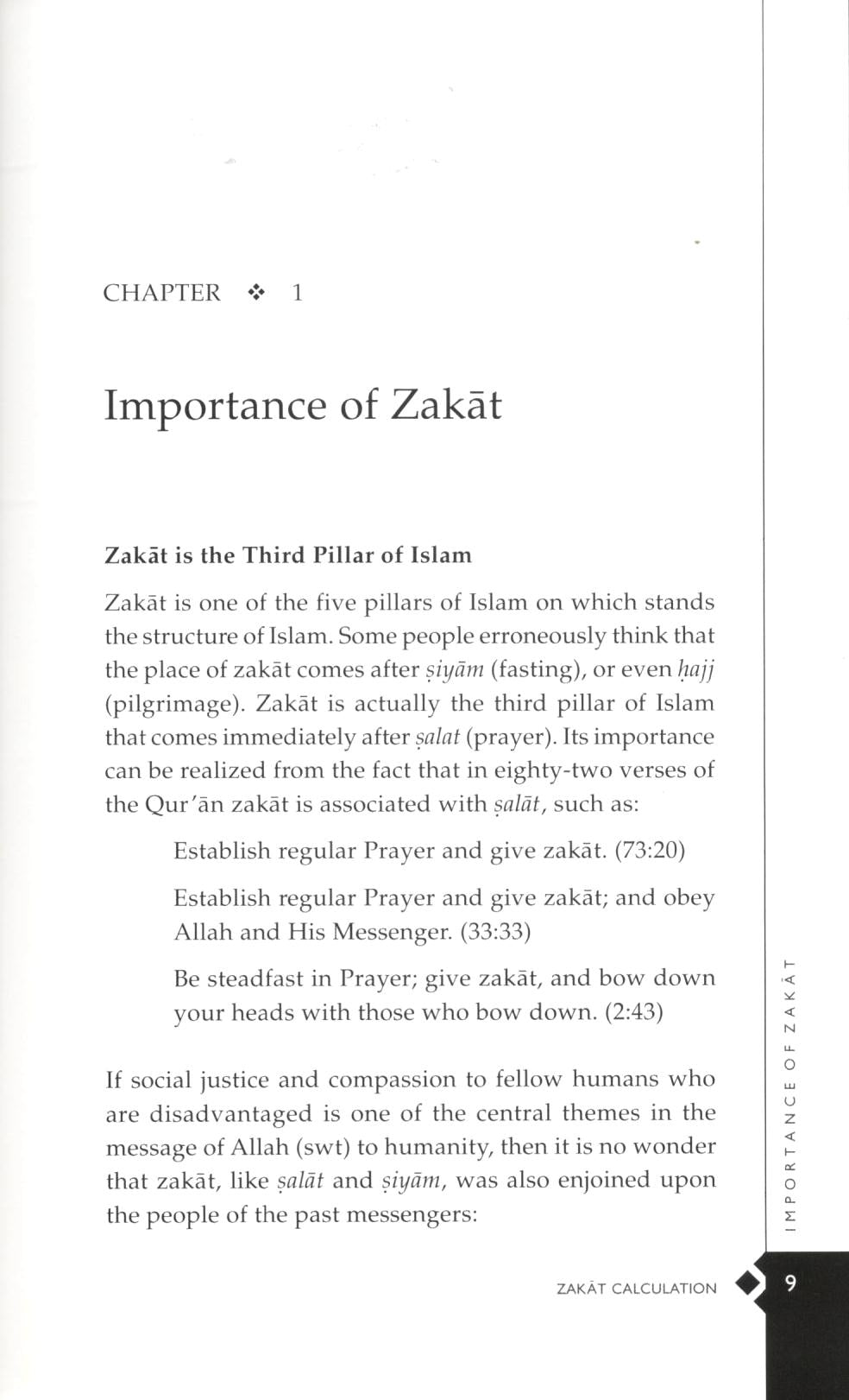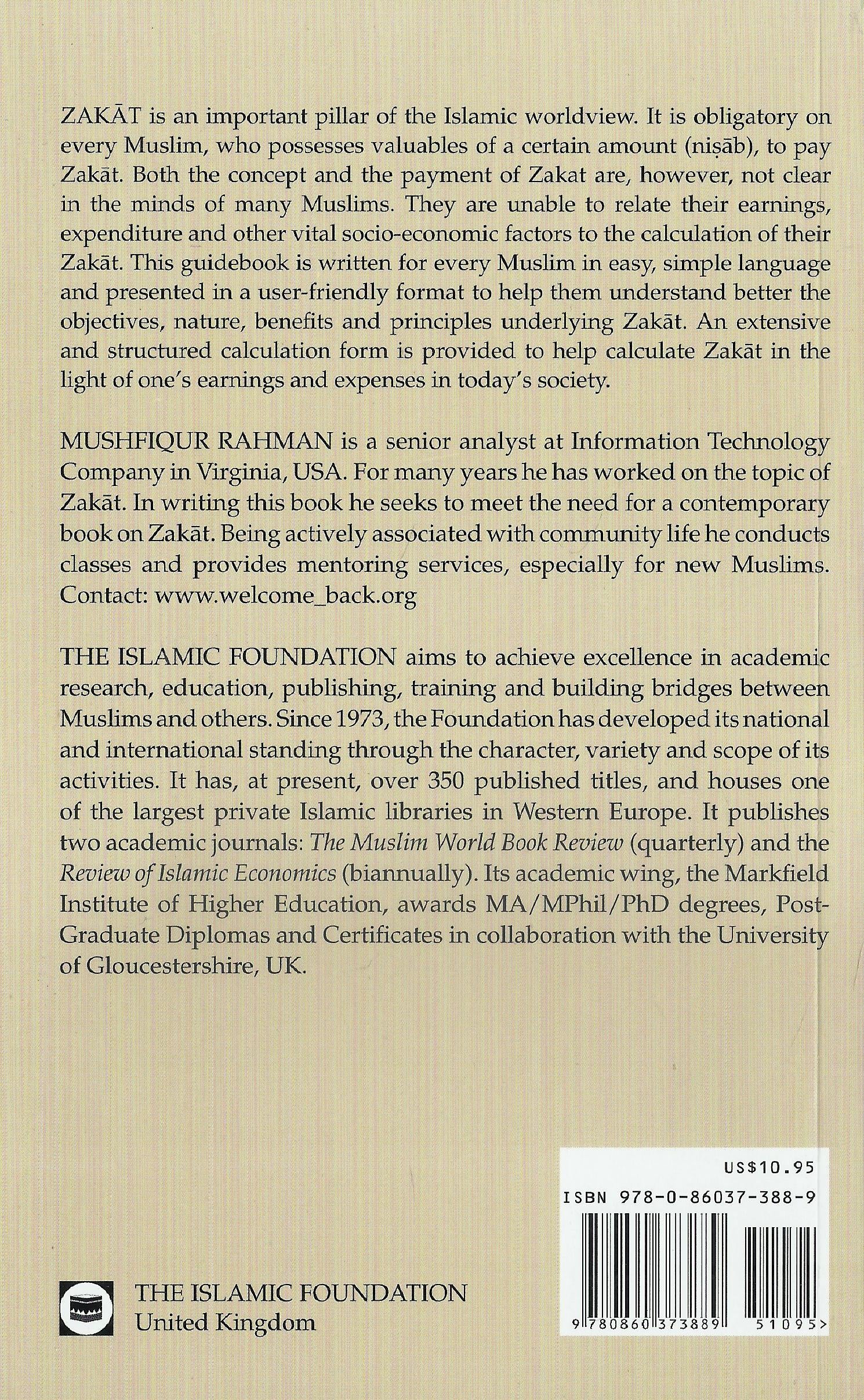 About the Book: Zakat is an important pillar of the Islamic worldview. It is obligatory on every Muslim, who possesses valuables of a certain amount (nisab), to pay Zakat. Both the concept and the payment of Zakat are, however, not clear in the minds of many Muslims. They are unable to relate their earnings, expenditure and other vital socio-economic factors to the calculation of their Zakat. This guidebook is written for every Muslim in easy, simple language and presented in a user-friendly format to help them understand better the objectives, nature, benefits and principles underlying Zakat. An extensive and structured calculation form is provided to help calculate Zakat in light of one's earnings and expenses in today's society.